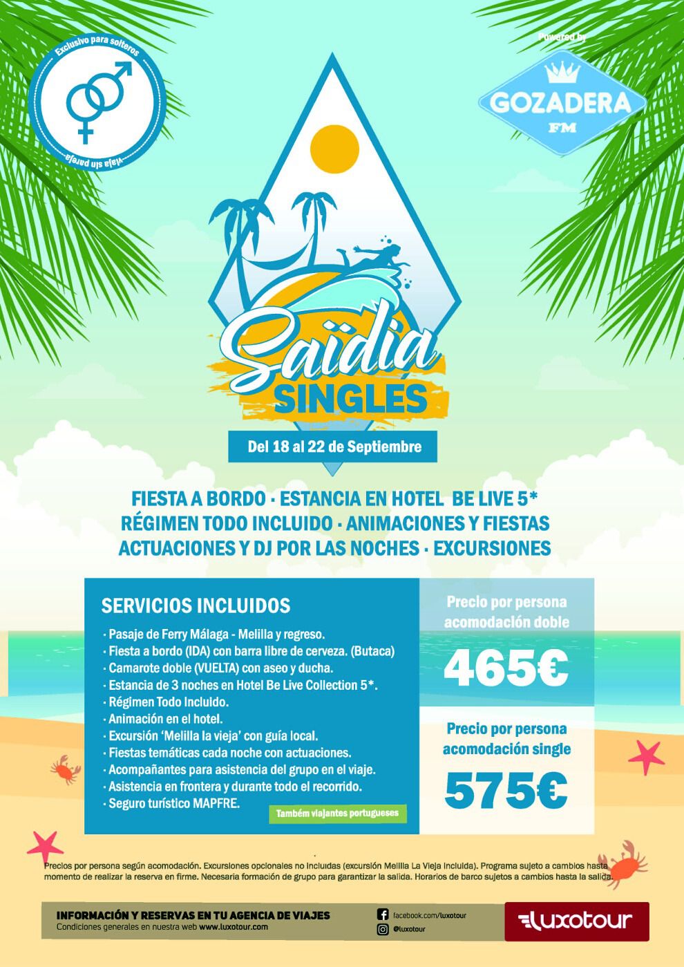 Este año, “Saïdia Singles” se celebrará del 18 al 22 de septiembre y efectuará su salida en ferry desde la ciudad de Málaga hasta Melilla, donde se cogerá un autobús para poner rumbo a Saïdia, al hotel de cinco estrellas Be Live Collection Saïdia, uno de los mejores hoteles de la zona, ya que ofrece increíbles vistas al mar, un spa donde relajarse, varias piscinas, bar y muchas otras opciones.