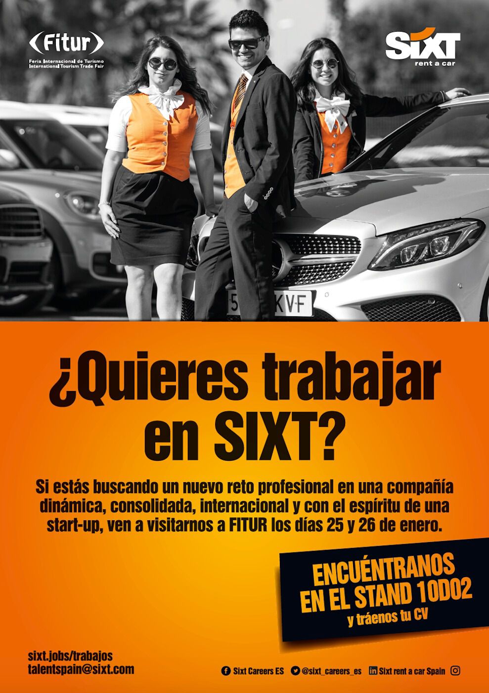 Tras el éxito conseguido en anteriores ediciones, SIXT celebra de nuevo en FITUR dos jornadas para incorporar nuevos candidatos a su plantilla. En el stand de SIXT se recogerán los currículum de las personas interesadas en formar parte de su plantilla y serán los días 25 y26 de enero cuando se lleven a cabo los ‘Recruitment Days’ en el que el equipo de Recursos Humanos estará a disposición de los visitantes, realizando entrevistas ‘in situ’ y facilitando información sobre las ofertas laborales actuales y sobre los programas de formación que se ofrecen.