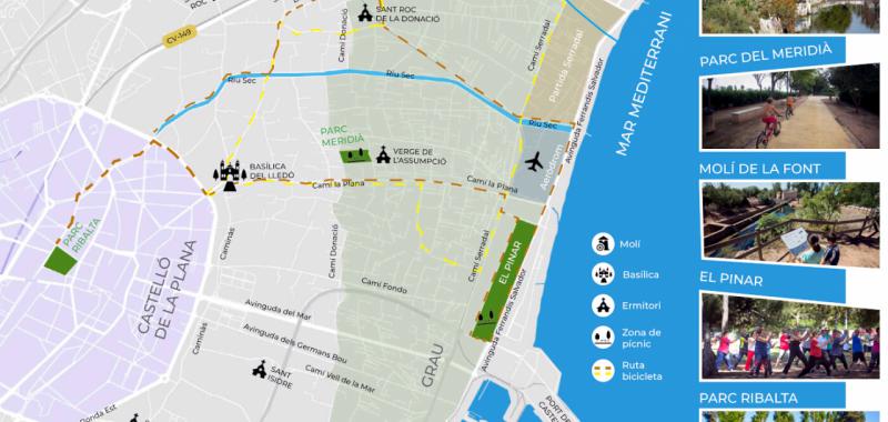El parque del Pinar es una alargada pradera de casi 2 kilómetros de largo por medio de ancho, casi paralela al mar, en el Grau. Su ubicación fue vital para que las dunas no avanzaran hacia los cultivos de la Marjalería. Un gran espacio natural de ocio, con un lago, dos zonas deportivas, una piscina, áreas de picnic y juegos infantiles, un auditorio… La Marjalería es un valioso ecosistema verde de 1,4 hectáreas, a caballo entre el espacio terrestre y el marino; un curioso entramado de acequias, caminos y barracas del siglo XVIII. Y el Molí de la Font es un manantial de agua dulce cuyo origen data del siglo XIV y que, históricamente, ha tenido diversos usos: para moler trigo, para la fabricación de tejidos y, en el siglo XX, para el cultivo de arroz.