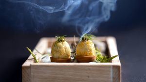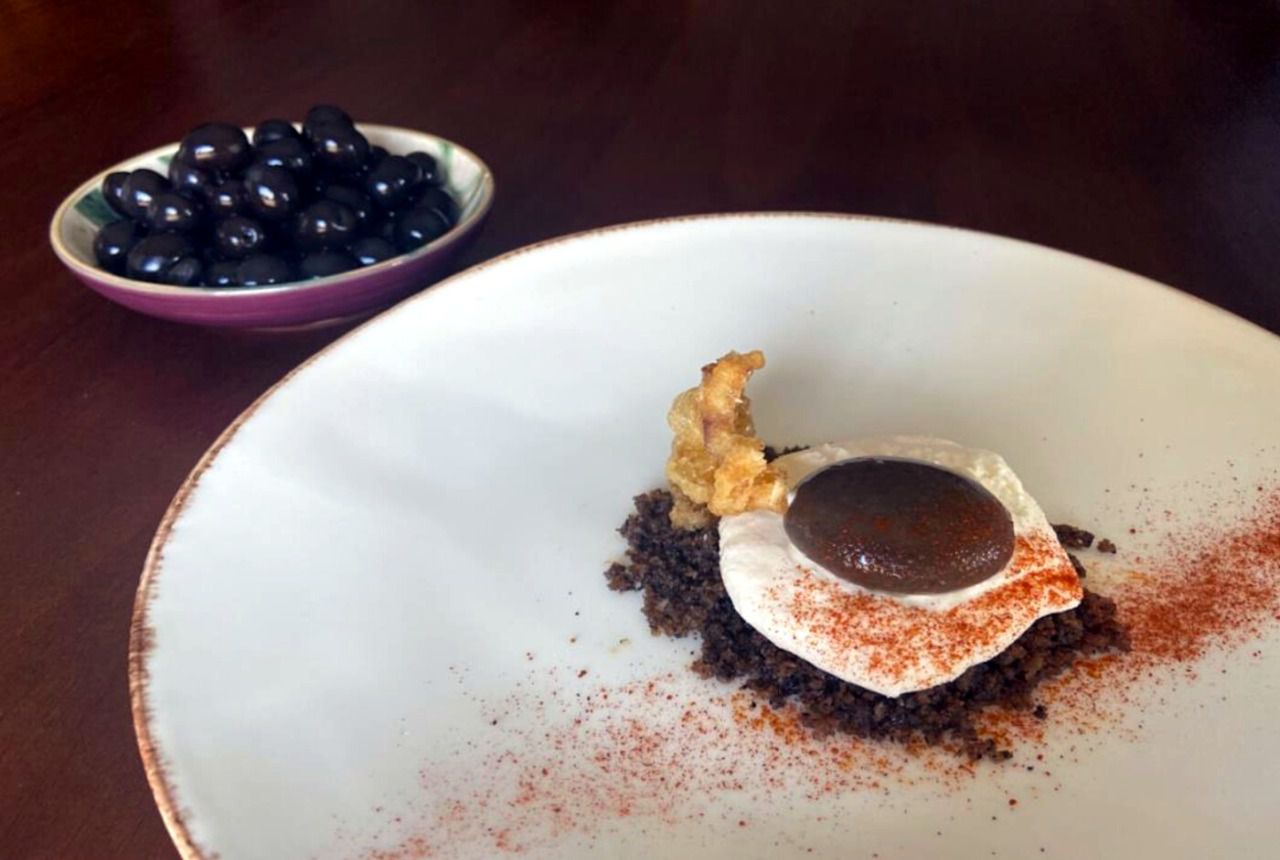 Aceitunas Gordal con almendras en tempura y con humus de pesto. (Miguel Ángel Mateos)