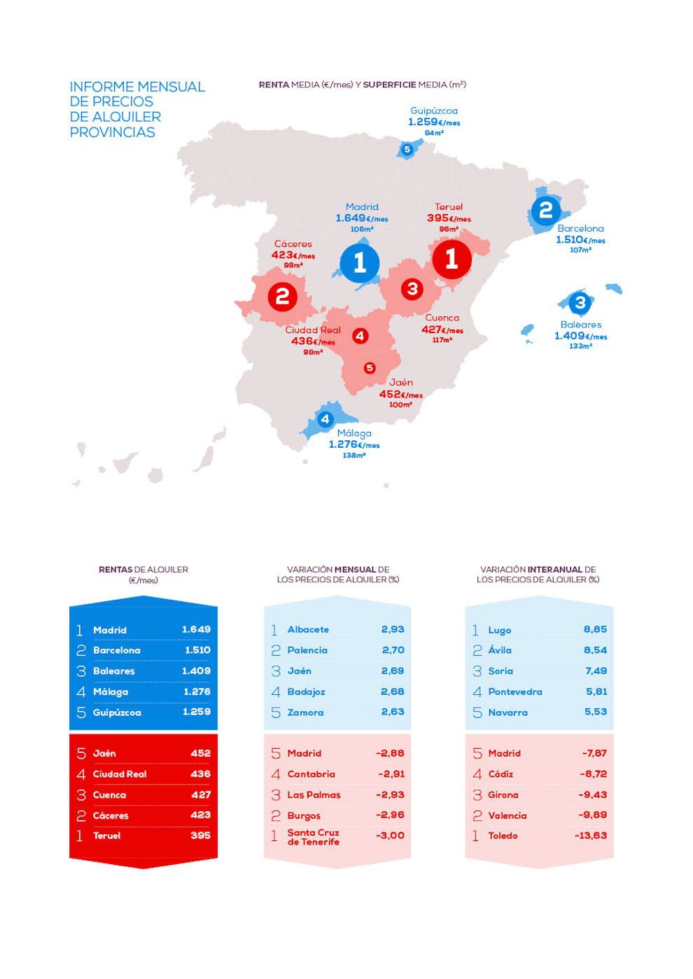 Madrid fue la autonomía con la mensualidad más cara para los inquilinos, por delante de Baleares (1.409 €/mes). En el ámbito provincial, Madrid fue la primera en el ranking de las rentas más elevadas de España. Por su parte, el piso tipo de alquiler en España tuvo en noviembre una superficie media de 108 metros cuadrados y una mensualidad media de 985 euros, bajando un -0,81% mensual. Respecto a noviembre de 2019, la caída fue del -0,10%.