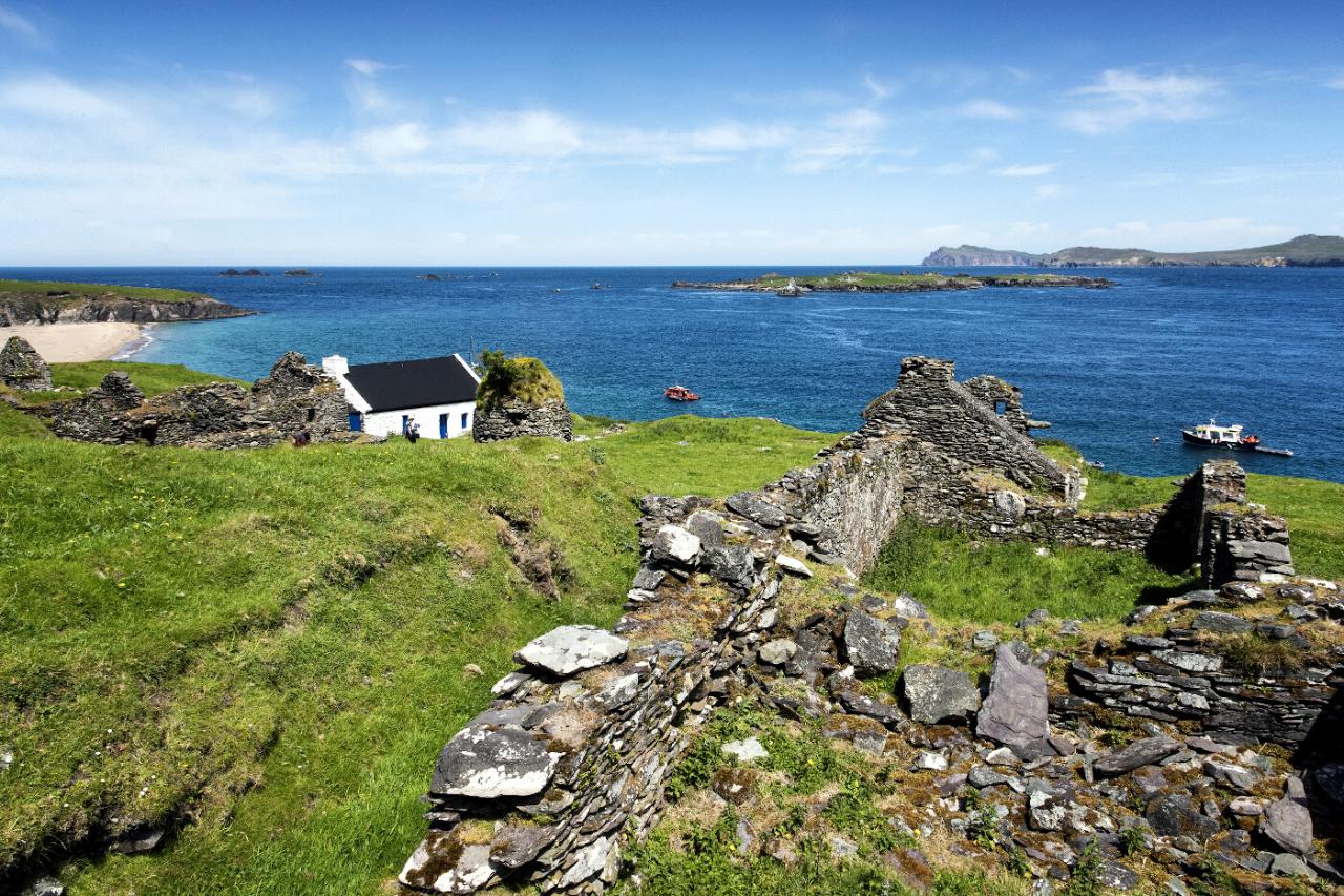 Con una extensión de más de 1.100 acres de terreno virgen, en su mayor parte montañoso, la Isla de Gran Blasket tiene aproximadamente cuatro millas de largo por media milla de ancho, y rebosa por todos sus rincones la esencia de la historia irlandesa y un ambiente natural incomparable.