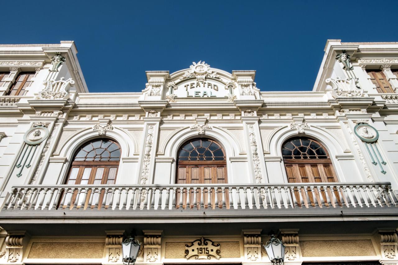 Las Islas Canarias también cuentan con escenarios emblemáticos. En la isla de Tenerife se encuentra una de las quince ciudades Patrimonio de la Humanidad de España: San Cristóbal de La Laguna. En ella, uno de los lugares que más llama la atención de los visitantes es la fachada del teatro Leal. De un estilo ecléctico, el edificio sigue el modelo de Antonio Pintor Ocete, un arquitecto granadino al que también se le atribuyen otras importantes obras en la isla como el ayuntamiento de Santa Cruz de Tenerife o la plaza de toros de la capital. Sin duda, el teatro Leal es una de las mejores muestras de la arquitectura civil canaria de principios del siglo XX.