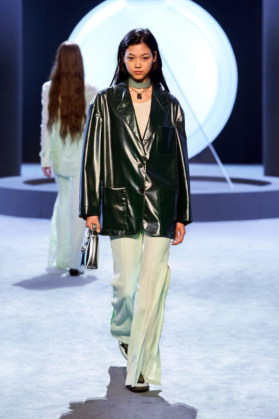 Zapatos: el calzado clave incluye botas de motorista espacial, zapatillas deportivas tipo calcetín, zuecos en napa de goma y una elegante reinterpretación del icónico tacón F de Ferragamo adornado con pedrería y acabado galvanizado.