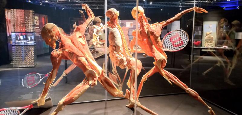 Las icónicas plastinaciones de personas de cuerpo entero, pertenecientes a la colección BODY WORLDS, están instaladas a lo largo del recorrido expositivo y sirven para explicar distintas funciones orgánicas o situaciones vitales con todo lujo de detalles.