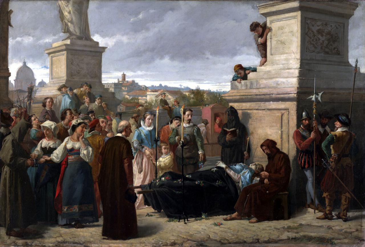 El cuadro de historia fue el género más valorado en la pintura española entre 1856 y 1890. Entre sus cultivadores, Francisco Pradilla fue el que obtuvo mayor reconocimiento nacional e internacional. Su obra ‘Doña Juana la Loca’ recibió el galardón máximo, la Medalla de Honor, en la Exposición Nacional de Madrid de 1878 y en la Universal de París de ese mismo año. Tanto el cuadro como su boceto se exponen permanentemente en la sala 75 del Museo. Pero la colección del Prado permite explicar, con otras obras, la dedicación del artista a esta temática, que inició con la copia de la obra de Lorenzo Vallés, ‘El cadáver de Beatrice de Cenci’, punto de partida para la asimilación del lenguaje pictórico que Pradilla desarrollaría de modo original en los años siguientes. Esta obra, reciente donación, se expone por vez primera.