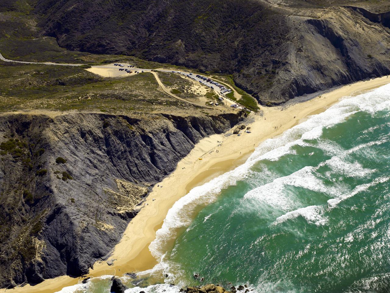 Naturaleza salvaje y belleza extrema. Este arenal, en el Parque Natural do Sudoeste Alentejano e Costa Vicentina (Vila do Bispo), es un espectáculo en todos los sentidos. Delimitado por dos colinas verdes y vigilado por robustos acantilados de hasta 140 metros de altura es el enclave perfecto para olvidar y ser olvidado. El contraste de las formaciones rocosas de pizarra, de un negro centelleante, con la arena blanca, invita a la relajación y a la admiración de un paisaje hermoso sin más. Un paraíso que, en días de buen mar, reúne a surfistas que juegan a esquivar la ‘Pedra da Lage’, un castillo rocoso que emerge en mitad del agua y sirve de abrigo a numerosas especies marinas.