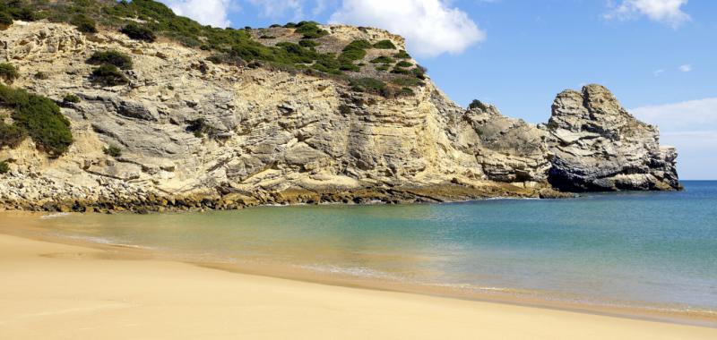 Imponente. Una ensenada en forma de concha de espectacular belleza en la que el océano se adentra para dejarte una orilla de aguas cristalinas que te invita al baño desde que llegas. De respaldo, un impresionante acantilado de pizarra oscura que protege del frío y del viento y, en su parte norte, los vestigios del mayor Ribat musulmán de la Península Ibérica, una fortaleza-convento de gran valor arqueológico que hace de este lugar un escenario de película. En mitad del agua, la ‘Pedra da Agulha’, un icono de la Costa Vicentina, vigila que nada altere la tranquilidad de los nidos de las cigüeñas blancas. La naturaleza todo lo tiene pensado aquí, para que nada salga mal.