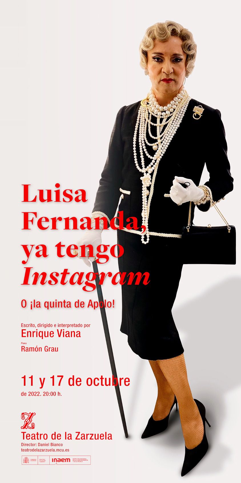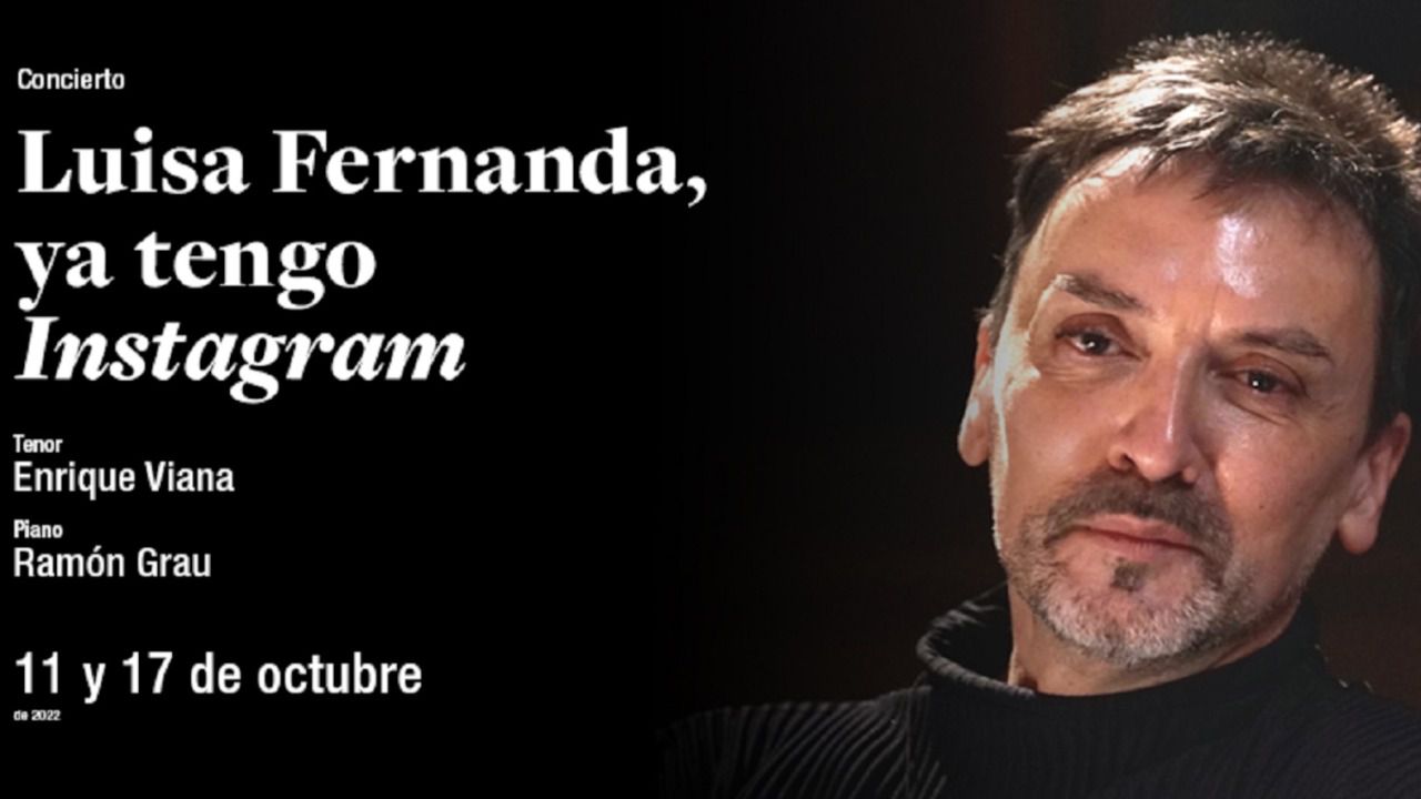 Tras el éxito arrollador durante tres noches en el ciclo Notas del Ambigú de la pasada Temporada, vuelve al Teatro de la Zarzuela, esta vez en la sala principal del coliseo, ‘Luisa Fernanda, ya tengo Instagram’, «cabaret lírico» del cantante, actor, director de escena y dramaturgo Enrique Viana, que volverá a estar acompañado por el pianista Ramón Grau. Se ofrecerán dos sesiones los días 11 y 17 de octubre a las 20h00.