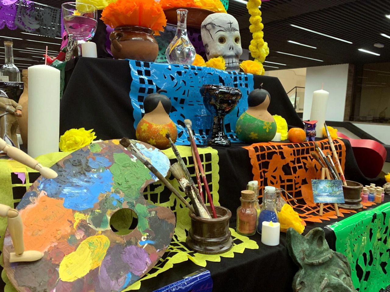 El altar de muertos instalado en el vestíbulo de entrada a la sala Guirau consta de varios niveles, en forma de escalera, decorados con un arco de flor de cempasúchil, papel picado de colores, banquete, velas y veladoras eléctricas o con batería, pan de muerto y calaveritas.