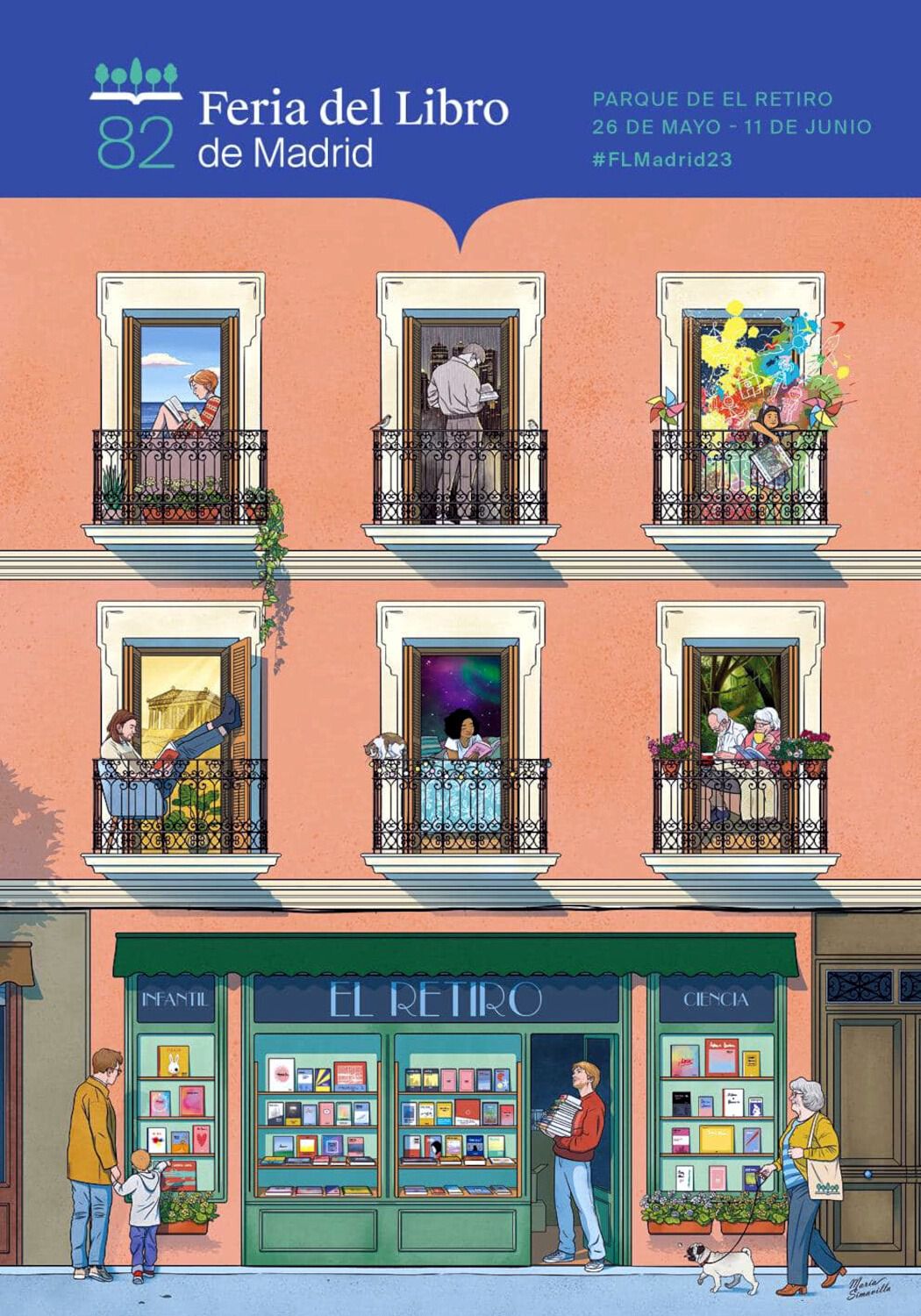Coincidiendo con el 90 cumpleaños de la Feria, la autora, María Simavilla (Salamanca, 1983), ha querido reflejar lo que este evento alrededor de los libros ha supuesto para Madrid. Una de las cosas que más disfruta son sus calles y edificios. Por eso elige, en clave de homenaje, una típica fachada madrileña para situar una escena protagonizada por una comunidad lectora diversa que podría pertenecer a cualquier barrio castizo de la ciudad.
