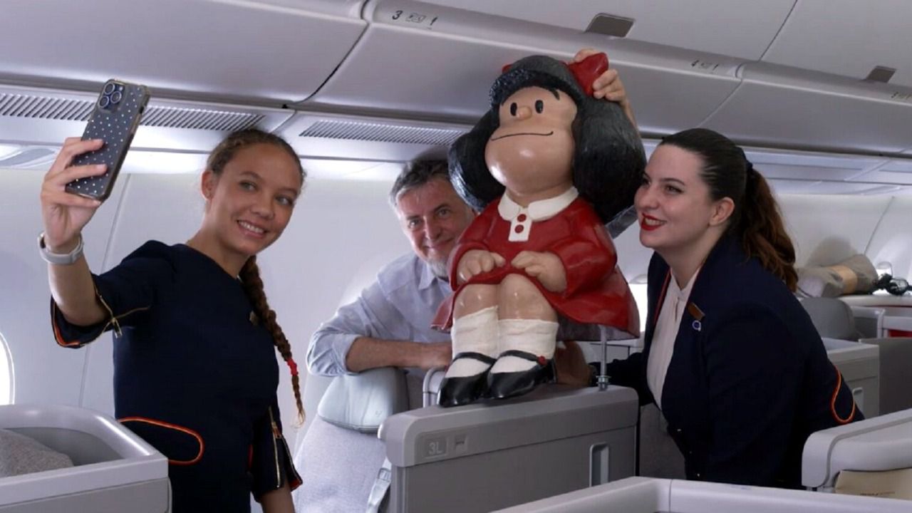 Mafalda, el célebre personaje creado por el dibujante argentino Quino, ha sido la pasajera especial de uno de los vuelos de Iberia entre Buenos Aires y Madrid. Concretamente, la aerolínea ha trasladado a bordo de la clase Business de uno de sus A350, el avión más moderno y eficiente de su flota, la escultura que representa a la pequeña pensadora y que este lunes será instalada en uno de los bancos del paseo central de Matadero de Madrid, como homenaje a su creador.