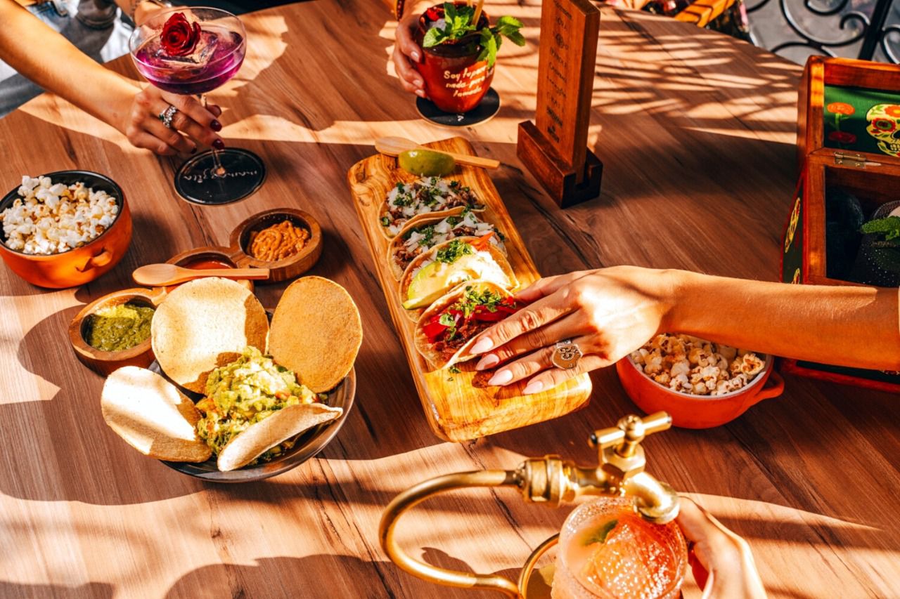 La experiencia se completa con una breve selección gastronómica que celebra al taco en sus versiones más auténticas: la cochinita pibil de Yucatán, cocinada durante horas como dictan los rituales mayas; los tacos al pastor, herencia de la fusión cultural que dio origen a la Ciudad de México; el taco gobernador de camarón, nacido en Mazatlán para seducir a un político con sabor del mar. Cada bocado es una memoria que viaja, igual que los cócteles, entre tradición y modernidad.