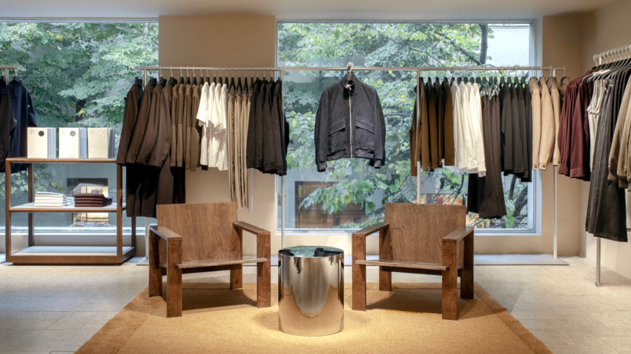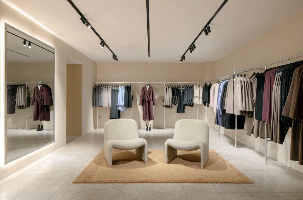 A lo largo de la tienda, el mobiliario marca el ritmo del recorrido. Las sillas escultóricas de contrachapado de Studio Goons se combinan con una mesa auxiliar cromada de inspiración setentera de Six The Residence. En la zona de moda masculina, la icónica silla Alky de Giancarlo Piretti se acompaña de una alfombra de bouclé tejida a mano de Kasthall, sobre un pavimento de terrazo de Grassi Pietre que se extiende por todo el espacio. En los probadores, los divanes y poufs de NORR11 aportan una suavidad orgánica, iluminados por la cálida luz albaricoque de los apliques Bon Bon diseñados por Helle Mardahl. En conjunto, estos elementos conforman un espacio definido por la integridad de los materiales y la artesanía más refinada.