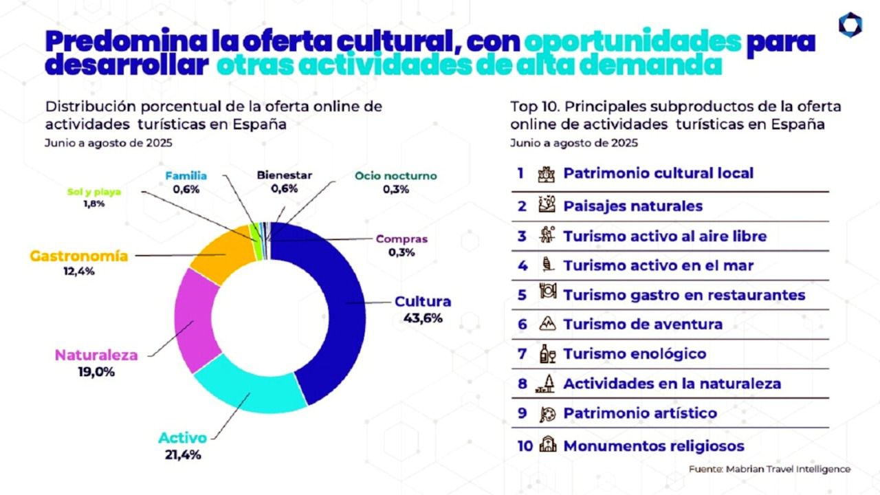 El 43,6% del total de la oferta de actividades y experiencias disponible en España se concentra en turismo cultural, vinculada a patrimonio local y arte. Le siguen planes de turismo activo (21,4%), naturaleza (19%) y gastronomía (12,4%).