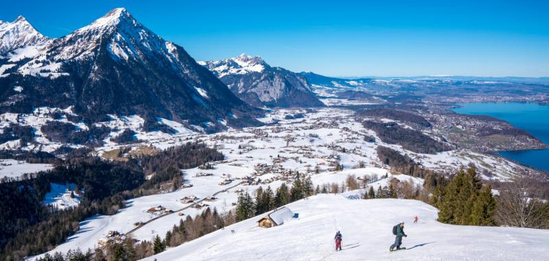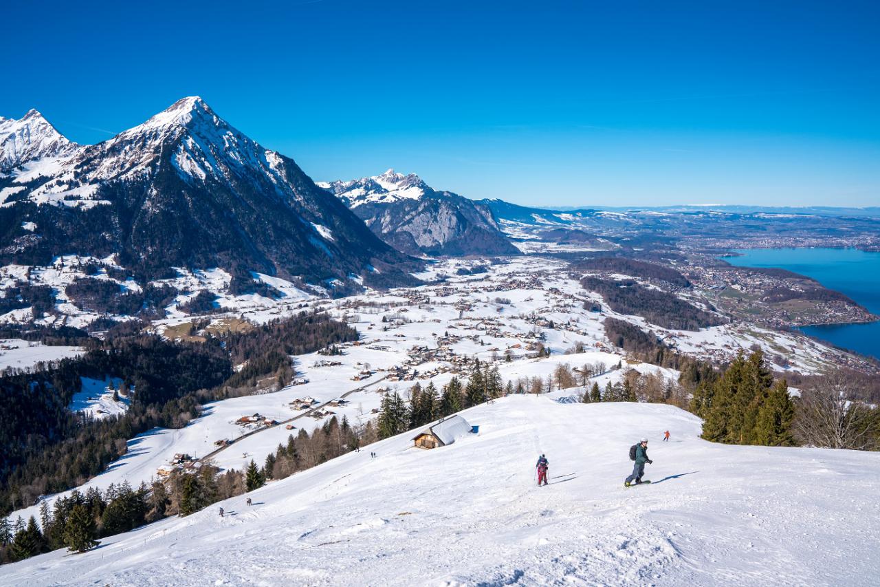 Y si la idea es explorar el valle a otro ritmo, el fondo de Lauterbrunnen ofrece un circuito de esquí de fondo junto al río Lütschine, entre cascadas y paredes verticales que enmarcan el paisaje. También se puede recorrer la zona de Habkern–Lombachalp con raquetas, sobre un moorland protegido con miradores al Thunersee y la posibilidad de ver animales alpinos. La naturaleza aquí se impone sin ruido, solo con la nieve como lenguaje común.