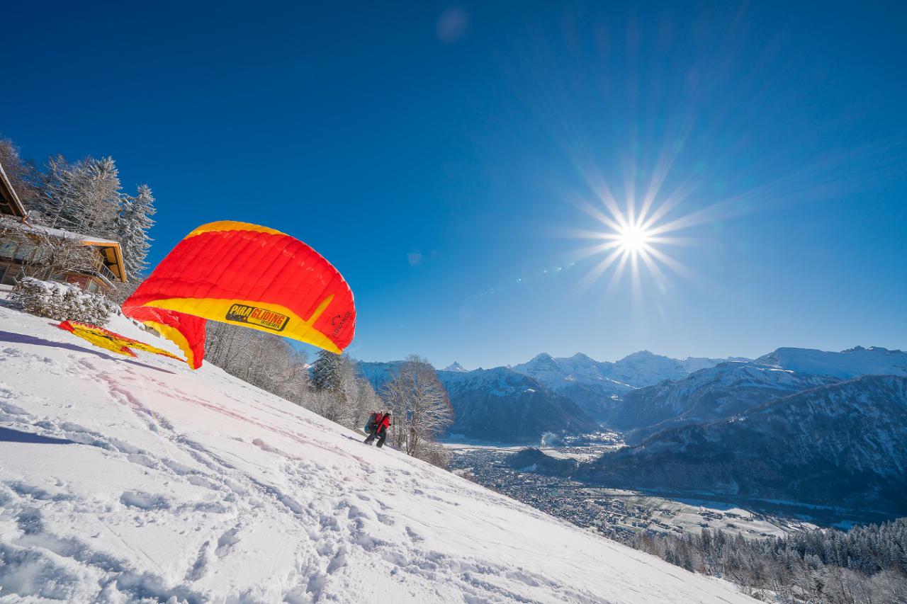 El invierno también se vive en el aire. Interlaken ofrece la posibilidad de disfrutar de vuelos en parapente biplaza, en los cuales las corrientes frías del valle hacen que despegar desde Beatenberg sea aún más espectacular en esta época del año. Flotar sobre los lagos helados, con las montañas enmarcadas en luz dorada, es un recuerdo que se queda mucho más allá de la foto.