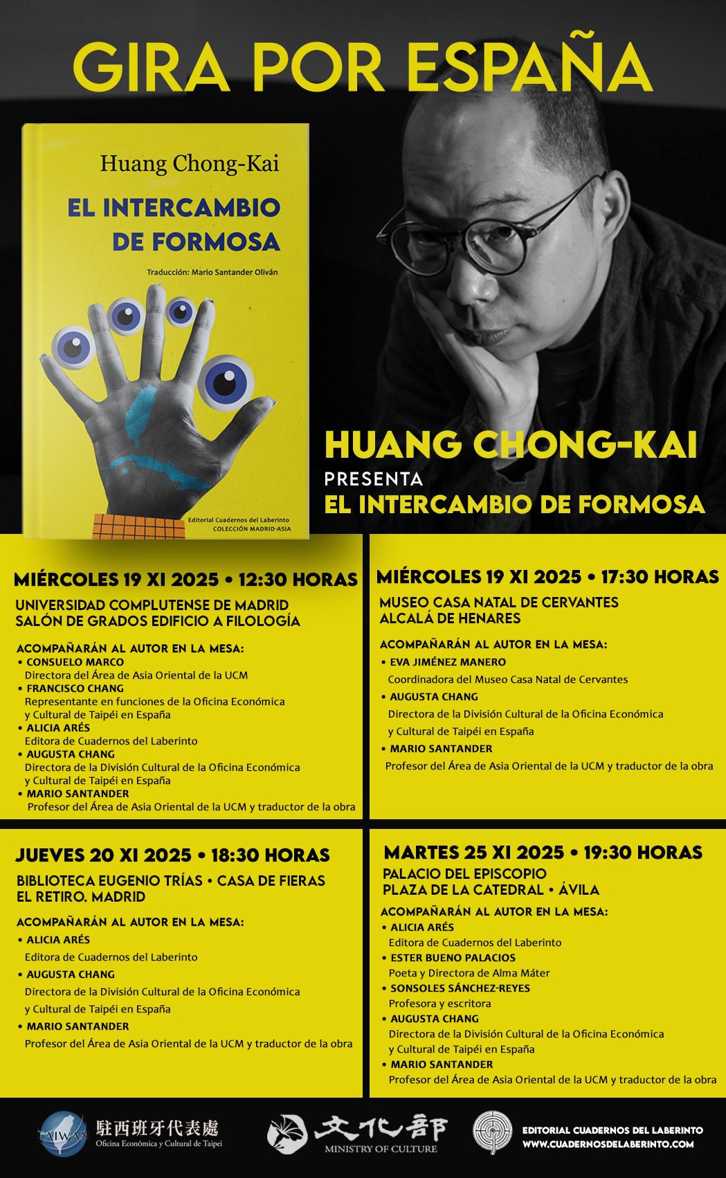 El Ministerio de Cultura de Taiwán y la Oficina Económica y Cultural de Taipéi en España en colaboración con la editorial Cuadernos del Laberinto, se complacen en presentar por primera vez en castellano, la novela “El Intercambio de Formosa” del reconocido autor taiwanés Huang Chong-Kai, uno de los novelistas más leídos y premiados de Asia. La traducción ha sido realizada por el profesor Mario Santander Oliván, del Departamento de Lingüística, Estudios Árabes, Hebreos, Vascos y de Asia Oriental de la Universidad Complutense de Madrid.
