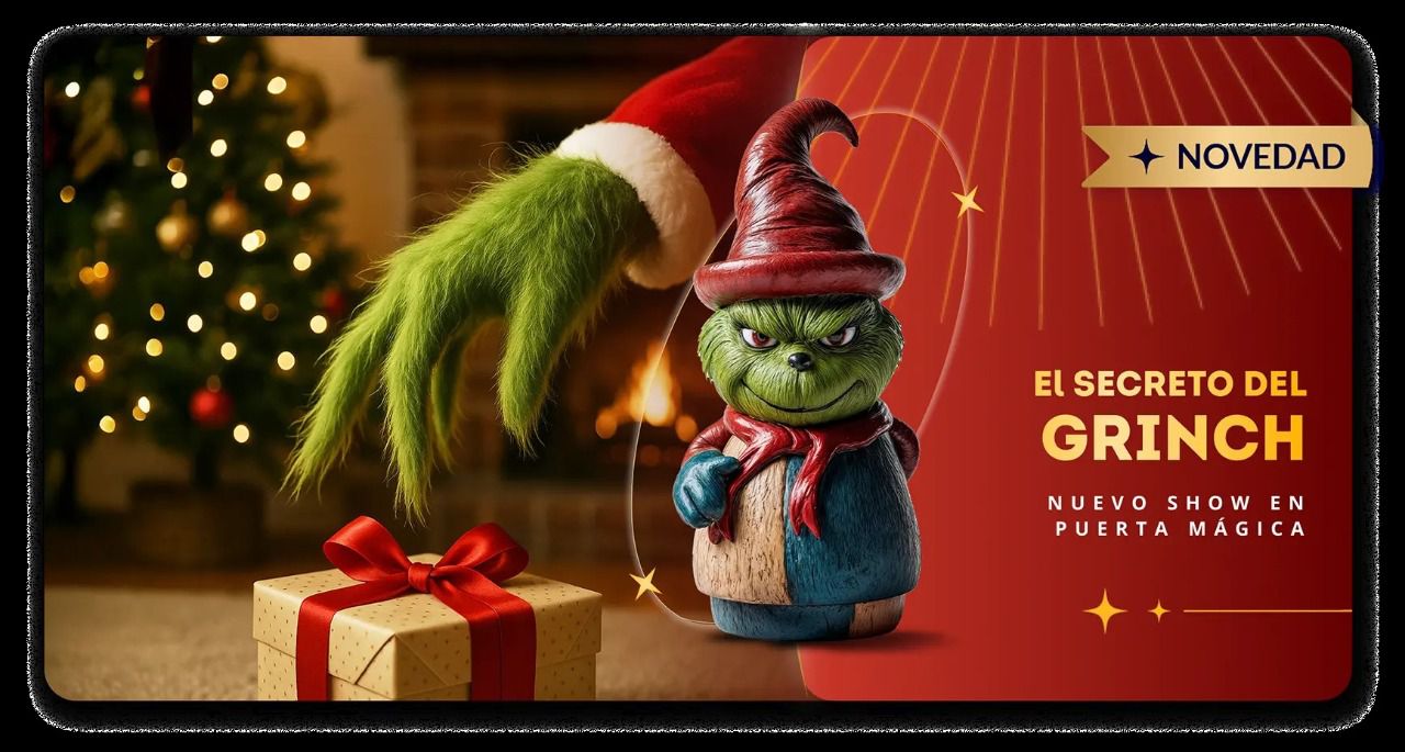 El lugar más icónico del parque es la Puerta Mágica que cobra vida con un impresionante videomapping de 1.000 m². Sobre su fachada se proyecta un espectáculo visual y narrativo que nos traslada al universo mágico de Casca y Nueces, dos entrañables osos que nos guían por una historia encantada. Además, cada hora se presenta el espectáculo familiar El Secreto del Grinch, con música, baile y voces en directo que llenan el escenario de energía y alegría.