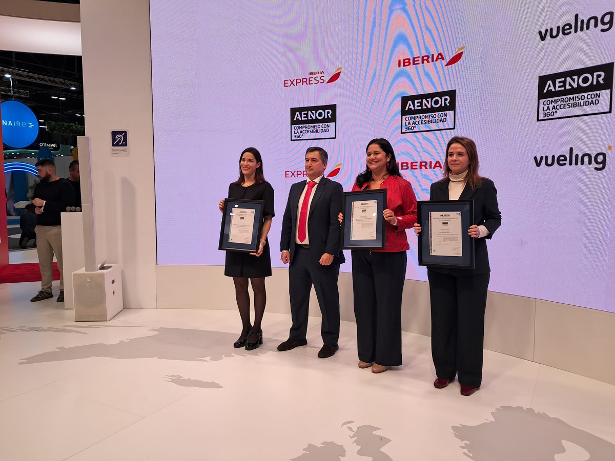Iberia, Iberia Express y Vueling recibieron la Certificación Compromiso con la Accesibilidad 360º que otorga AENOR y se convierten en las primeras de su sector en recibir este sello. Este reconocimiento respalda el compromiso voluntario de las tres compañías con la accesibilidad universal y avala sus respectivas hojas de ruta en materia de sostenibilidad y experiencia del cliente.