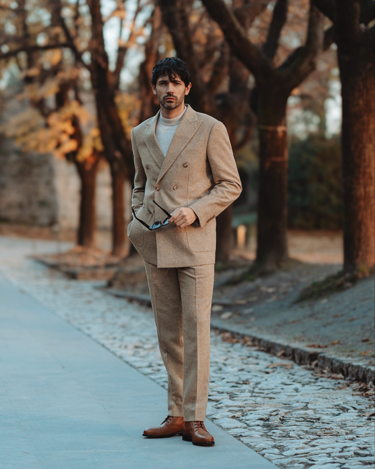 El traje de doble botonadura no perdona imperfecciones: si los solapados frontales se abren, si el pecho no queda bien ajustado, si las solapas con pico caen por hombros desalineados o si las proporciones son incorrectas, toda la silueta se ve afectada. La confección a medida garantiza que el frente se mantenga liso, los botones se alineen a la perfección y la estructura de la chaqueta se adapte a tu cuerpo, trabajando a tu favor y no en contra.