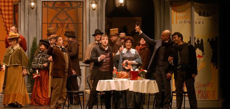 La obra contrapone el romance apasionado de tintes melodramáticos de una costurera y un poeta (Rodolfo y Mimi) con el amor humorístico de un pintor y una cantante (Marcello y Musetta). Contando con el libreto de Giacosa e Illica, la puesta en escena se basa en la obra literaria de Henri Murger La Vie de Bohème, una colección de viñetas que retrata a un grupo de bohemios que habitan en el Barrio Latino de París.