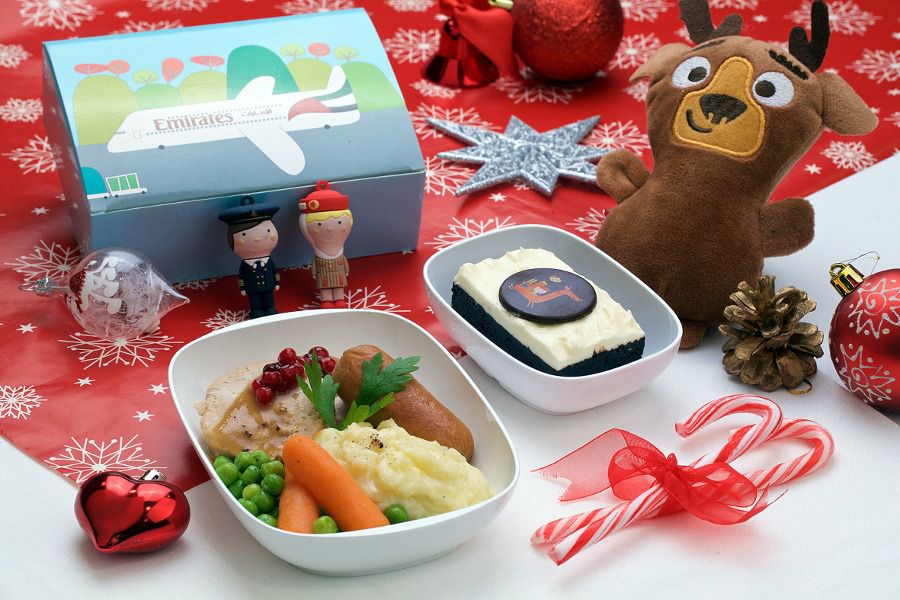 Emirates quiere que los más pequeños saquen también el máximo partido de sus viajes. El menú festivo para niños incluye pavo asado y puré de boniato, zanahorias y guisantes, un bastón de caramelo y los botones de chocolate de Emirates’ Little Travellers como regalo especial.