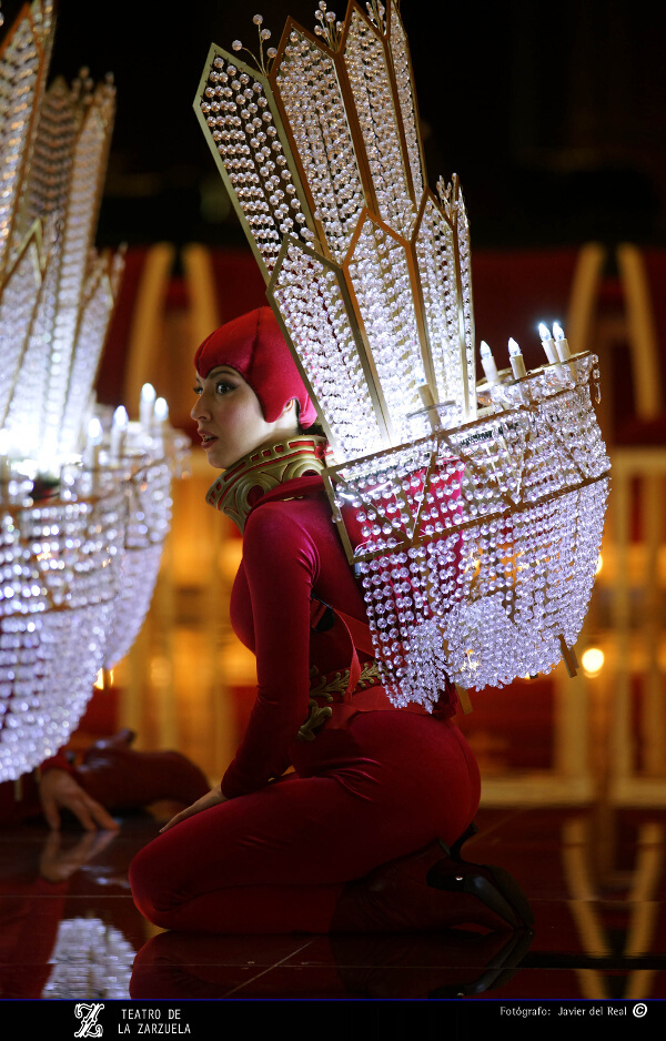 Las seiscientas butacas del patio han sido desmontadas y en su lugar se ha instalado el escenario: una gran circunferencia con suelo de espejo, que, entre otros muchos efectos sorprendentes, incluso llega a convertir a la majestuosa lámpara en una protagonista más de la obra. ¿Y dónde ha ido entonces a parar el público? Pues además de los palcos de los diferentes pisos, el respetable ocupa nada menos que el escenario verdadero del Teatro. Para ello, en ese sagrado lugar donde han actuado García Lorca o María Callas, se han instalado unas gradas que albergarán a más de 200 personas.