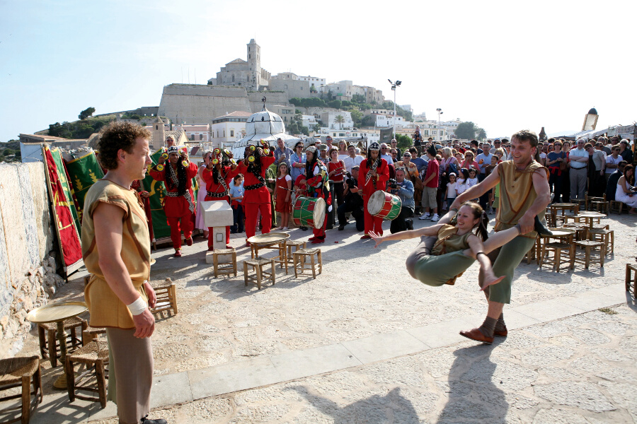 Las calles del casco antiguo, que data del año 654 a.C. y que ha protegido la isla durante siglos, se visten con coloridas banderas, alfombras, telas y estandartes que recuerdan a Ibiza Medieval de la época. La fiesta rinde homenaje a la historia multicultural de invasores y ocupantes de Ibiza, que incluye fenicios, romanos, árabes y últimamente cristianos catalanes. De hecho, muchos sienten que esta mezcla histórica de culturas ha contribuido a la creación del espíritu internacional y cosmopolita que caracteriza a la isla.