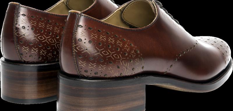 Como si fueran tatuajes, los motivos perforados recorren la exquisita piel del original modelo oxford de la línea 'Híspalis' llenándolo de sabor español. Realizado a partir una sola pieza de piel y con una única costura, el detalle se inspira en las piezas de sellería tradicional y está realizado a láser con gran precisión sobre las mejores pieles de ternera cuidadosamente seleccionadas y pulidas a mano por los artesanos de la casa; diseño español tatuado en la piel.