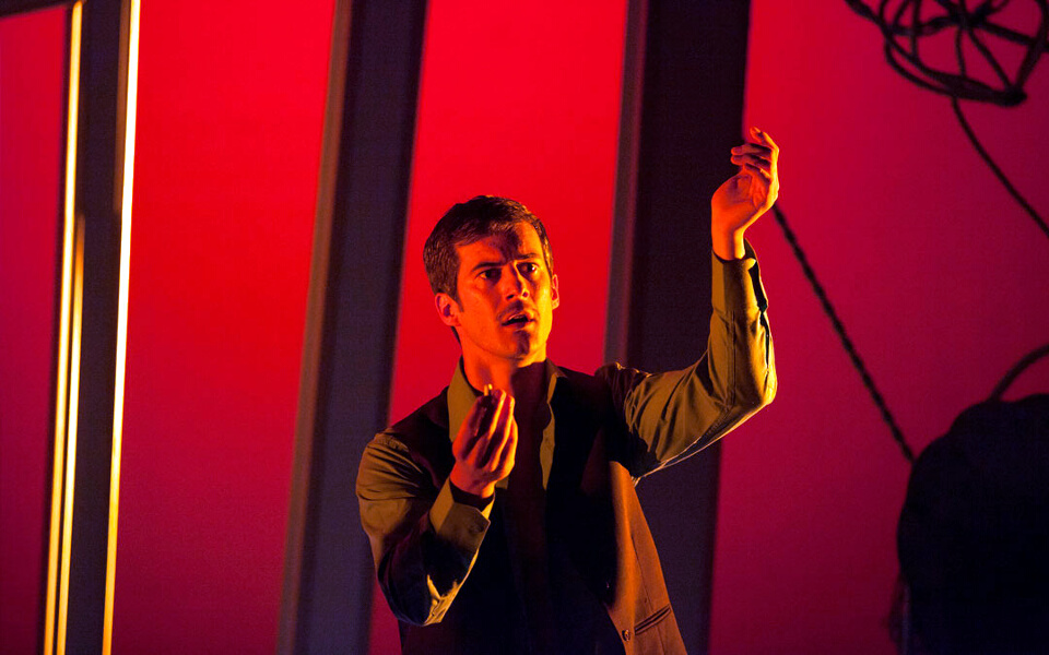 En un escenario escueto e ingenioso, con marcos de puertas luminosos, figuras asimétricas, cuadros, un despacho y un dormitorio, Solomon expresa sus angustiosas ¿cualidades?, su esposa la necesidad de amar y ser amada por parte de Solomon y su psiquiatra ¿amigo? la lucha por conseguir ¿sanar? de sus problemas a Solomon…