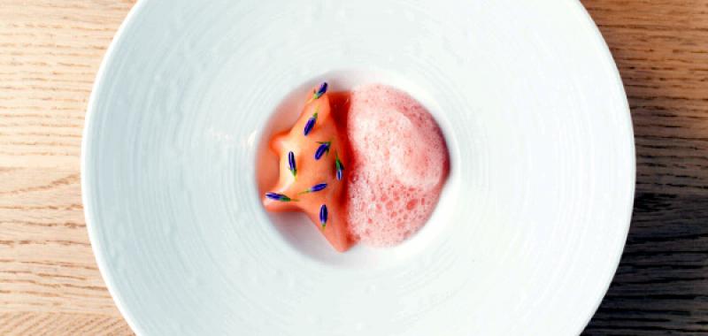 El menú arranca con tres snacks para abrir boca: un pan de chorizo, un paté de hígado de cerdo con toppings de corteza de cerdo y pimienta negra (para untar con el pan) y un tartar de lomo “doblao” sobre tosta crujiente de pan candeal. El primer pase es un bocado fresco a base de jamón ibérico, mahonesa y tomate de Miajadas en diferentes texturas (agua y helado) que limpia el paladar para dar paso al siguiente plato, un bao hecho con tinta de calamar y relleno de guiso de oreja de cerdo ibérico y calamar en el que Toño hace un guiño al tradicional bocata de calamares. El siguiente plato, la careta de cerdo con cigala y caldo de ave, es un clásico de Atrio en carta desde hace más de 20 años.