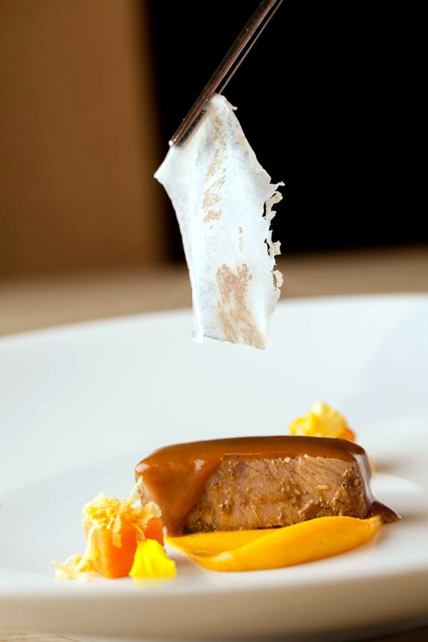 En la misma línea está concebido el siguiente bocado: atún con boniato y papada ibérica o, como a Toño le gusta llamarlo, atún ibérico. Se trata de una pieza de tarantelo (con gran infiltración grasa) adobada con el aliño típico de la prueba de matanza extremeña (un picadillo de carne aderezado con orégano, ajo, pimentón y aceite) que se sirve marcada a la parrilla y casi cruda en su interior y que se acompaña de un finísimo velo de papada ibérica que, al contacto con el pescado, se funde con la grasa del atún desvelando la calidad del cerdo y de su alimentación a base de bellotas. Los dos últimos platos antes de los finales son pluma crujiente con salsa de miel y mostaza y milhojas de patata crujiente y rabo de cerdo glaseado (de carne melosa y piel crujiente) acompañado de una salsa Périgord elaborada con el fondo de cerdo y trufa.