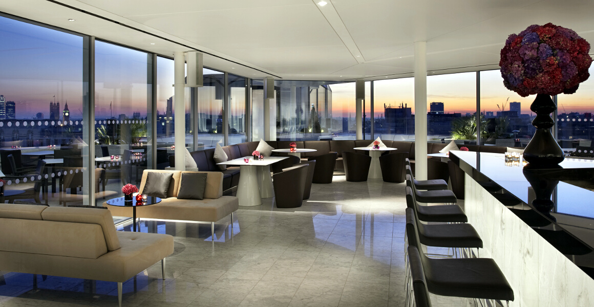 RADIO Rooftop Bar preside el imponente skyline de Londres con vistas panorámicas a lugares emblemáticos, como Somerset House, The Shard, the London Eye, el Big Ben y la Catedral de St Paul.