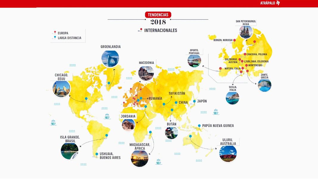 Las tendencias finalizan con el análisis de los lugares de larga distancia que mayor éxito tendrán este año entre los usuarios del portal en España: Chicago (EE.UU.), Papúa Nueva Guinea, Isla Grande (Brasil), Uluru (Australia), Ushuaia (Argentina), Bután, Groenlandia, Japón, Rumanía y Madagascar.