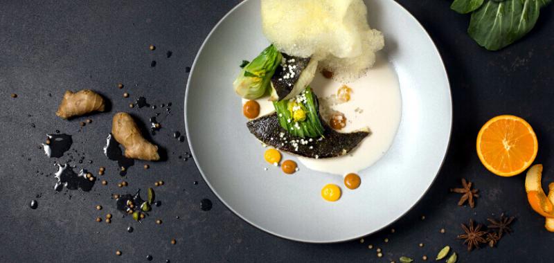 Entre los platos principales destacan los pescados blancos como el rodaballo, en este caso con una sopa de coco y curry que nos transporta a los sabores del sur de Asia, o el “Mar y Corral”, que se compone de un carpaccio de langostino con picantón en diferentes texturas, cocinado a baja temperatura, acompañado de polvo de aceituna negra, maíz, pimientos confitados y endivias.