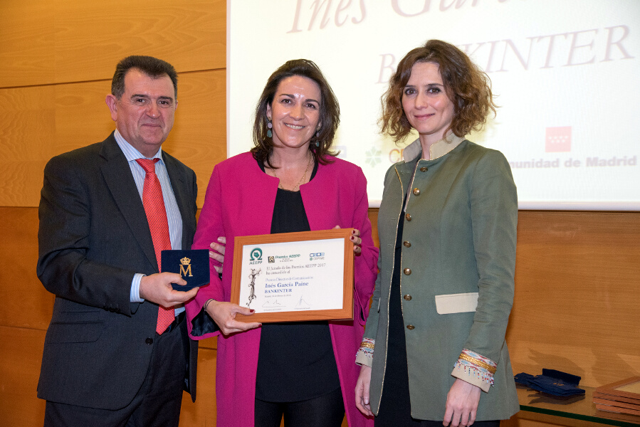 - Premio Director de Comunicación. Es otra de las nuevas categorías que la Asociación ha introducido este año. Con este premio se quiere reconocer al profesional que, por sus méritos, haya destacado en el año por su contribución al desarrollo de la comunicación empresarial y/o institucional. El jurado ha decidido conceder este galardón a Dª Inés García Paine, directora de comunicación de Bankinter, por haber sabido reconducir la comunicación de un banco, en sus orígenes industrial, convertido en banco comercial de una manera destacada en el último año.