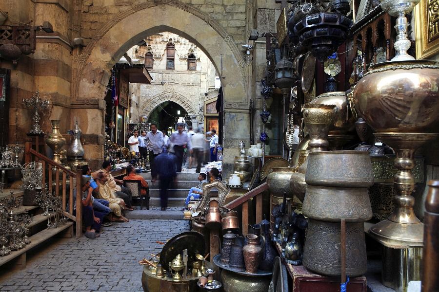 La tarde se echa encima y los mercaderes vuelven a exponer sus mercancías en los bazares. Vayamos al más famoso, a Khan el Kalili. Disfrutar de un paseo por el bazar de Khan el Kalili es una fiesta para los sentidos, con la intensa mezcla de colores y olores que emanan de los puestos de especias.