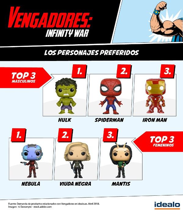 Dado que la película reunirá a más de 40 personajes de la franquicia, idealo.es, el comparador de precios líder en España, ha querido averiguar cuál es el personaje de Marvel preferido por los españoles, basándose en la demanda de productos asociada a cada uno de ellos. Como resultado, los fans españoles han encumbrado al Increíble Hulk y a Nebula como sus personajes favoritos de la saga. Bruce Banner, álter ego del gigante de color verde, volverá a la Tierra y puede ser un factor importante para unir a todos los superhéroes de nuevo en la lucha contra Thanos por defender el planeta. Por su parte, Nebula es el personaje femenino favorito de los fans, hermana de Gamora e hija adoptiva del supervillano Thanos, al cual guarda un profundo rencor. Tras Hulk, los personajes masculinos favoritos de la audiencia son dos clásicos, Spider-Man y el personaje interpretado por Robert Downey Jr., Iron Man. En el lado femenino, tras Nebula, las favoritas son una clásica del equipo de los Vengadores interpretada por Scarlett Johansson, Viuda Negra, y Mantis, personaje que debutó el año pasado en la segunda entrega de Guardianes de la Galaxia.