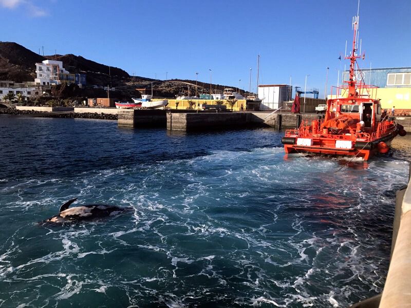 Por otro, en la tarde de ayer lunes, 4 de junio, se avistaba un ejemplar flotando en el Mar de Las Calmas de Calderón Tropical, también llamado Calderón de Aleta Corta (Globicephala macrorhynchus), que fue remolcado posteriormente por la Salvamar con base en El Hierro desde playa Tejada hasta el Puerto de La Restinga.