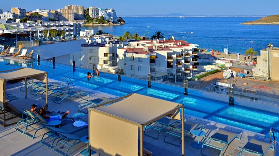 El recién estrenado Hotel Calvia Beach The Plaza, Managed by Meliá (Mallorca), cuenta con un espacio único, ROOFTOP NINE, que aloja dos piscinas flotantes de efecto infinito de 48 metros de largo con vistas al horizonte del mar mediterráneo y a la bahía de Palma. Además, en esta misma terraza está ROOFTOP NINE Lounge BAR y Restaurante.