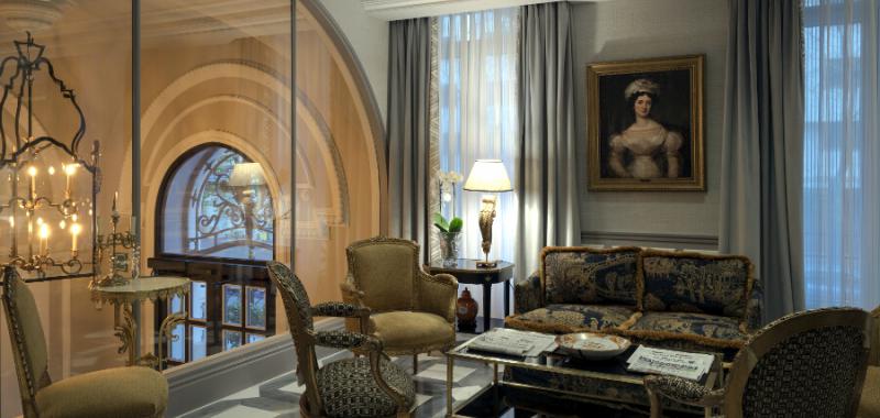 Decorado por el prestigioso interiorista Lorenzo Castillo, premio AD al Mejor Decorador 2014, el hotel presenta un carácter urbano y cosmopolita y una estética ecléctica y atemporal en la que se mezclan muebles de diseño, tejidos modernos y sorprendentes juegos cromáticos con materiales nobles como maderas lacadas, mármoles policromados, terciopelo, papeles pintados a mano según la técnica francesa del siglo XVIII y cortinas bordadas con pasamanería. Sus estancias albergan, además, una magnífica colección de antigüedades y obras de arte europeas del siglo XVIII y finales del XIX, entre las que se encuentran una chimenea de mármol verde de 1830 y un imponente lienzo de Carlos III perteneciente a la primera época de Mengs que rinde homenaje a la villa de Madrid reivindicando su abundante patrimonio artístico y cultural.