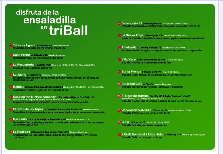Del 26 al 29 de septiembre, 20 locales de triBall, ofrecen las mejores ensaladillas rusas. ¿Cuántas recetas de ensaladilla hay? Tantas como hogares en España, aunque patata, atún y mayonesa no suelen faltar. Los paladares en busca de nuevas experiencias estarán encantados con la ensaladilla de alga Nori, tomates confitados y sardina ahumada, en La Jauria o la de falso canelón de papaya verde, con rúcula, ceviche de gambas a la diabla y su vinagreta, en Mezcalito, o la ensaladilla Dashi -¿qué será?-de 7 Craft Bar en 7 Islas Hotel, y ¿qué tal una ensaladilla de gambones con albahaca, tomate seco y algas, en Desengaño 13?