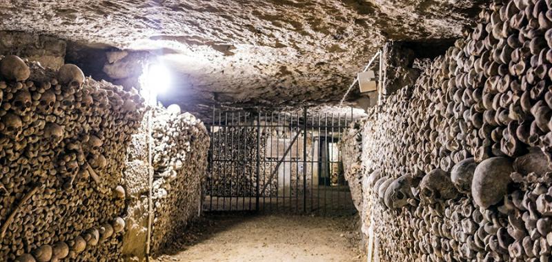 Las catacumbas parisinas son un famoso laberinto de túneles subterráneos cuyas paredes están formadas por toneladas de huesos y calaveras humanas apiladas al milímetro. Se calcula que más de seis millones de cadáveres en el siglo XVIII, - incluyendo personajes tan conocidos como Montesquieu o Robespierre - fueron traídos aquí en carruajes desde muchos de los cementerios de la ciudad que se habían quedado sin espacio. Después de la Torre Eiffel, las catacumbas son el destino más popular para los turistas en París.
