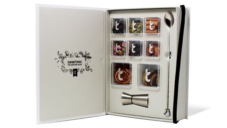 The Genuine Gin&Tonic Book es una original caja con forma de libro y con un elegante diseño que la convierte en un objeto decorativo ideal para integrar en la biblioteca o en el mueble bar de cualquier hogar. En su interior, contiene las herramientas básicas para preparar un gin tonic perfecto: el jigger o medidor (para calcular la cantidad idónea de ginebra), la cuchara rizada para servir la tónica y ocho botánicos Toque. Estos son láminas de fresa (que aportan color y dulzor), frambuesas liofilizadas (que se pueden infusionar), mini rosas (que añaden fragancia y son muy vistosas), bayas de enebro (infalibles con cualquier ginebra), canela cassia (ligeramente picante), cardamomo (entre dulce, cítrico y picante) y lima y naranja sanguina deshidratados. Esta última, también cítrica pero con un toque más meloso y dulce que la lima.