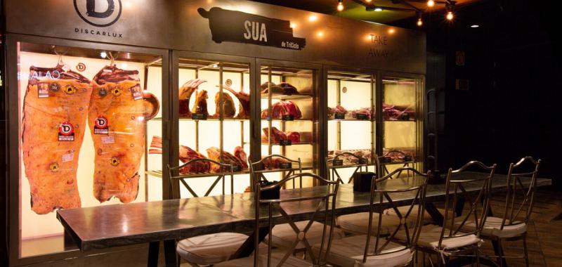 Gracias al mejor distribuidor cárnico de España, Discarlux, SUA expone, en una vitrina de 5 x 2 metros una variedad única de cortes y piezas de carne, muchas de ellas maduradas durante meses, para conseguir un sabor y propiedades únicas.