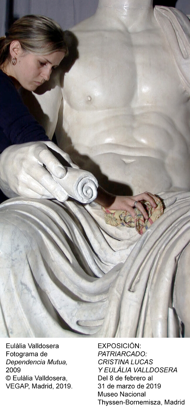 Dependencia mutua (2009), de Eulàlia Valldosera, presenta una acción que tuvo lugar en el Museo Arqueológico de Nápoles, donde vemos a una mujer de la limpieza (alter ego de la artista) bruñendo la estatua de un emperador romano, tocando y mancillando el objeto de culto en el templo del arte. Los fantasmas de la libido femenina afloran en la anodina acción gracias al tratamiento fílmico.