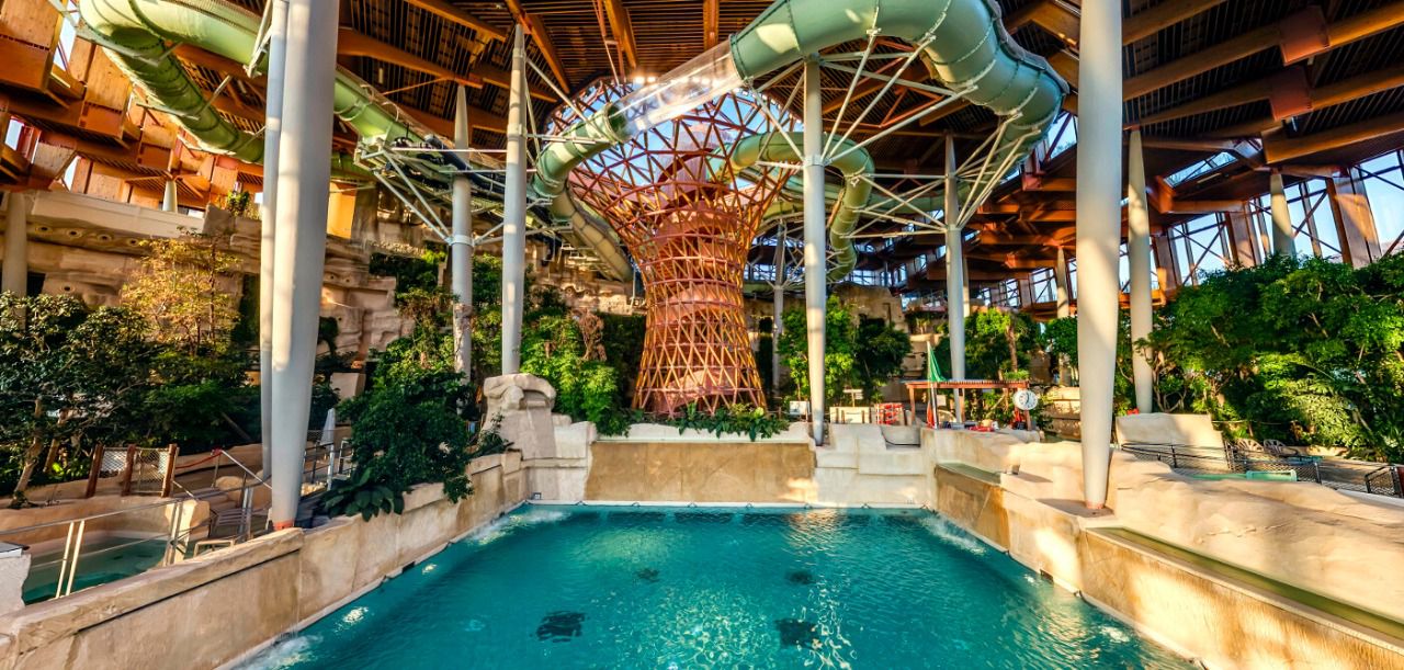 El Aqualagon, de 27 metros de altura, es uno de los espacios acuáticos más grandes de Europa. Con forma de pirámide de cristal de 9000 metros cuadrados, alberga increíbles jardines colgantes y crea un mundo salpicado de islas y plantas de agua. El espectáculo continúa en las lagunas al aire libre, donde las cascadas y el vapor de agua crean escenarios singulares para los bañistas. En conjunto, nada más y nada menos que ocho toboganes, tres jacuzzis burbujeantes, una piscina de olas y juegos acuáticos variados para todas las edades. Para aquellos que quieran mantenerse en forma durante las vacaciones sin salir del agua, tienen a su disposición numerosas actividades deportivas, entre ellas, aquabike, aquagym, aquajump o water basket.