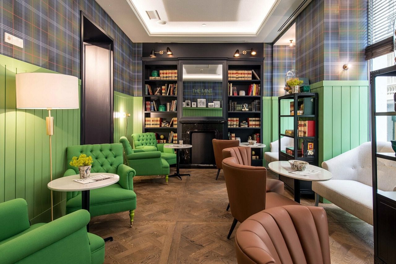 El alojamiento ha sido diseñado por el afamado interiorista Jaime Beriestain, que ha respetado la esencia del edificio construido entre 1916 y 1919, y ha integrado los elementos clásicos con un estilo vanguardista acorde con este concepto innovador de hotel. Su originalidad sorprende y se percibe nada más entrar, siempre con los tonos verdes y turquesas de la menta presentes. La tradicional recepción no tiene cabida en Vincci The Mint 4* donde la experiencia comienza realizando el check-in en una barra de bar, en un ambiente relajado y distendido, en el que se pueden realizar todas las gestiones de tu estancia de forma rápida mientras disfrutas de un refresco o un cóctel en este peculiar bar.