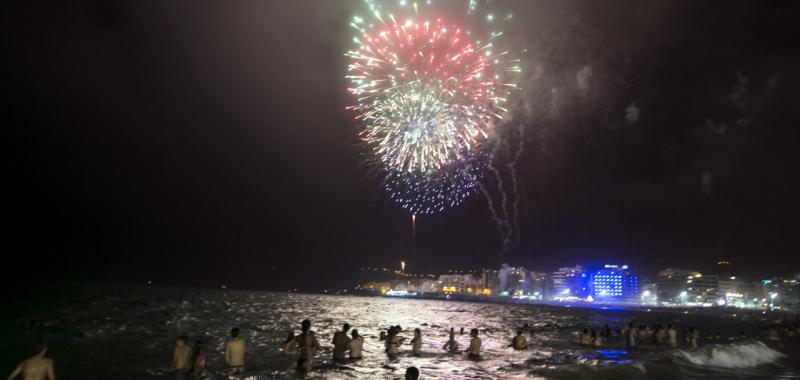 Será a partir de las 21:00 horas cuando comienzan las celebraciones fuertes en la playa, en el lado de La Puntilla, desde donde se lanzarán los fuegos artificiales a medianoche. Antes habrá conciertos: los de los grupos Puerto Candelaria, Última Llave y Ketama, grandes protagonistas de la fiesta. No será extraño encontrar a jóvenes bañistas que han alargado su día de playa para sumarse a la fiesta nocturna, preparados para la ocasión. Grupos de usuarios colman la arena, mientras en el paseo peatonal se concentra paulatinamente una multitud que da cuenta del perfil más festivo de la ciudad. Una urbe con más de medio siglo de historia.